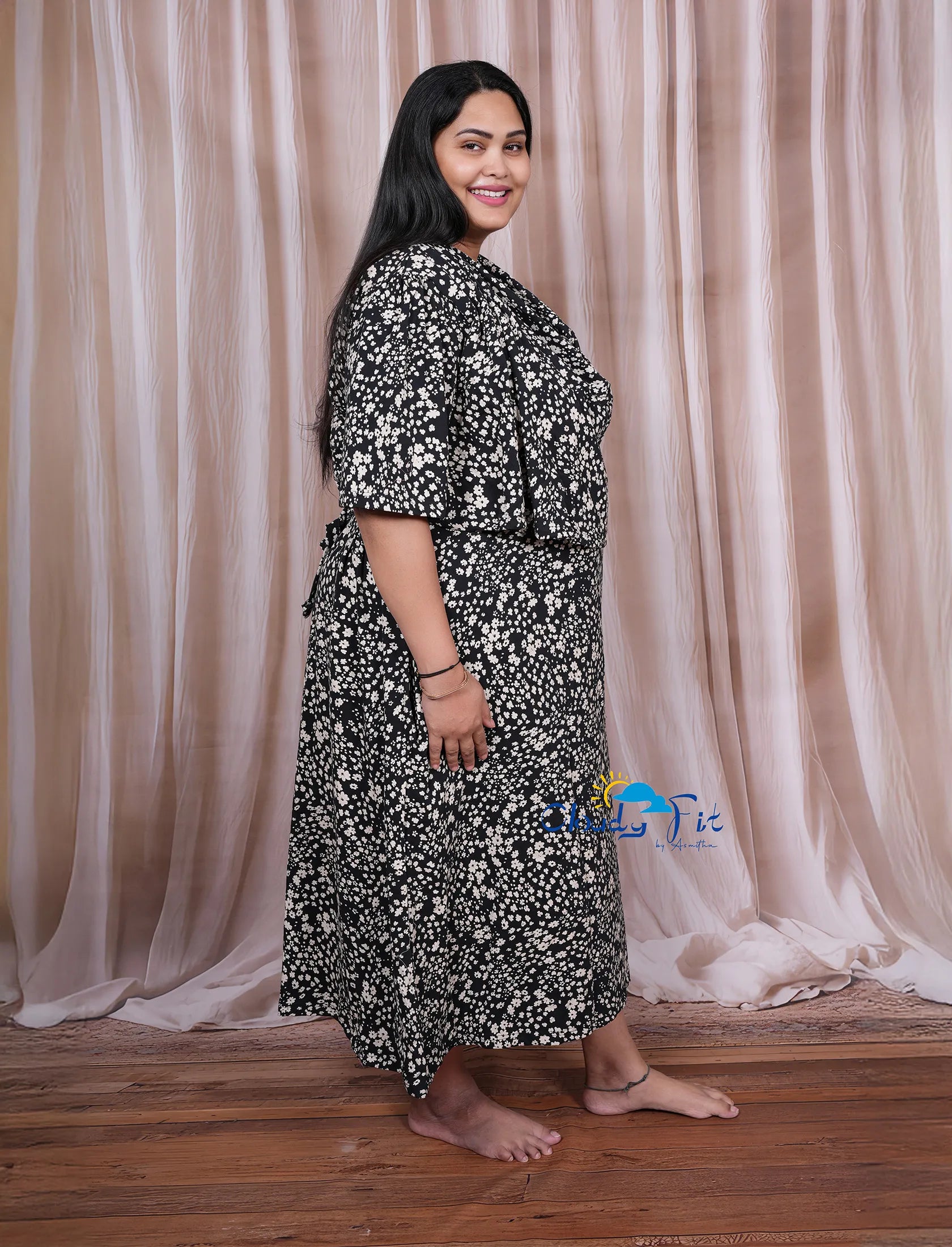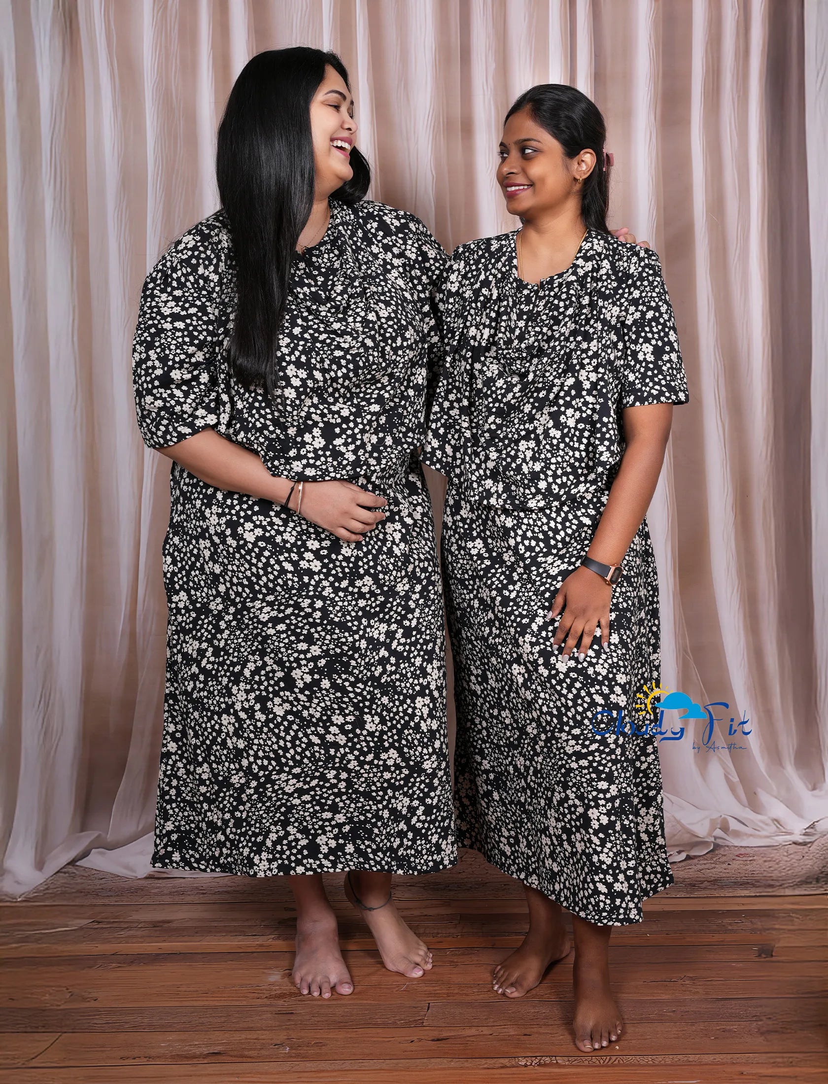 Stay relaxed and stylish at home with our 3/4th length nighty, crafted from pure cotton butter-soft fabric for all-day comfort. The elegant black base with white floral print adds a touch of charm to your everyday loungewear. Designed thoughtfully for modern women, this nighty features a cape overlay for extra coverage around the bust area, making it perfect for feeding mothers. It also comes with a side pocket for convenience and a waist knot for an adjustable fit. Experience the perfect blend of comfort, practicality, and effortless style â?? ideal for feeling free and comfortable at home.